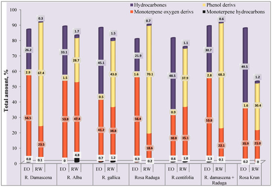 We grouped the chemical components and, after comparing the essential oil and hydrosols, we obtained the volatile profile of the different roses (Figure 2).