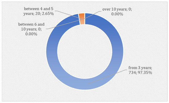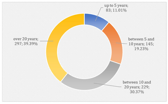 Nevertheless, they are in the group of households making efforts for greener energy production because they have decided to install photovoltaic panels. The age of the properties where the installations in question are used is shown in Figure 3. Almost 40% of the properties used by the respondents are over 20 years old, and about 30% are between 10 and 20 years old. About 30% of respondents use photovoltaics in relatively new homes, which are less than 10 years old. The structure described above shows that photovoltaic panels are installed mainly in the old housing stock corresponding to the age structure of single-family houses in Poland. Notably, the owners of these properties see the need to modernize their energy systems and decide to diversify their energy sources with the use of photovoltaics.