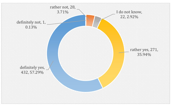 The analysis of the survey results began with the assessment of the reliability of the survey questionnaire, for which the Cronbach’s alpha test was used. The value of the Cronbach’s alpha coefficient for the study in question was 0.8828, which allows us to conclude that the reliability of the developed research tool is good, close to perfect, and enables the continuation of the planned analyses. Detailed results of the Cronbach’s alpha test for individual survey questions forming the research construct are presented in Appendix A.