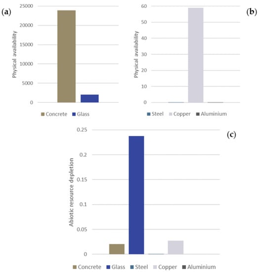 Results of physical availability for concrete and glass (a), as well as steel, copper and aluminium (b); abiotic resource depletion for considered materials (c).