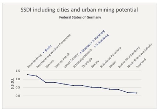 As explained in the previous section, the urban mining potential is assessed together with the quarry mining potential by a modified SSDI* indicator. Further methodological notes can be found in Section S2 in SI. The results for the different federal states in Germany are presented in Figure 3 and Table 3. In the ranking, Brandenburg, including Berlin, performs best because it has large mining areas combined with a small proportion of urban areas in relation to the total area. Saarland ranks last because it has a high proportion of urban areas combined with a medium proportion of extraction areas.