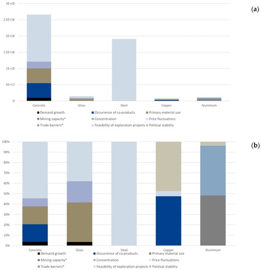 Results for locally traded concrete and glass, as well as globally traded metals steel, copper and aluminium in the dimension of socio-economic availability: (a) absolute scale, (b) displayed by percentage. The categories marked with asterisk indicate that they do not consider locally traded materials.