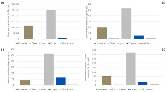 Results for the environmental impacts (global warming (a), eutrophication (b), acidification (c) and photochemical oxidant creation (d)) of concrete and glass and the metals steel, copper, and aluminium.