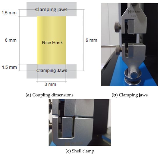 The rice husk placed between the clamps had a clamping dimension of 1.5 mm, and the pressure exerted on the clamp was homogeneous for all tests so that the threaded screw turned by 2.5 turns. For the clamping of the specimens, the clamps were selected and installed as shown in Figure 1b,c.