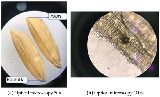 Micrographs of the rice husk samples were taken by a standard digital microscope Olympo CX31 (Japan) as shown in Figure 2, where the awn and the rachilla can be observed; the edge is where the upper part of the husk ends and the rachilla is where the seed is held; using a magnification of 100× on the edge parallel to the cut, an external surface with micro lumps (epidermis) can be initially observed; in unequal conditions for a striated structure and in the presence of protuberances, part of the sub-hypodermis can also be observed [21].