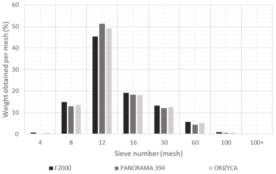 The weight obtained per sieved mesh is shown in Figure 3. The #12 mesh size (1.7 mm) had the highest husk rice retention for the three evaluated husk classes (Orizyca, Panorama 394, and F 2000), with a combined average husk retention of 48.6%; up to mesh #30 (0.6 mm), there is a cumulative average husk retention of 79.83%. The rice husk with the highest retention percentage was Panorama394 by mass concentration in the #12 mesh (51.3%) and an accumulated retention up to the #30 mesh of 81.8%; in contrast, the F 2000 class presents a higher retention percentage in the #12 mesh (45.3%) and an accumulated retention up to the #30 mesh of 77.7%