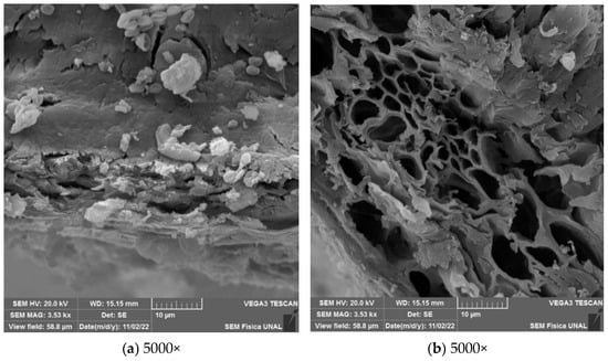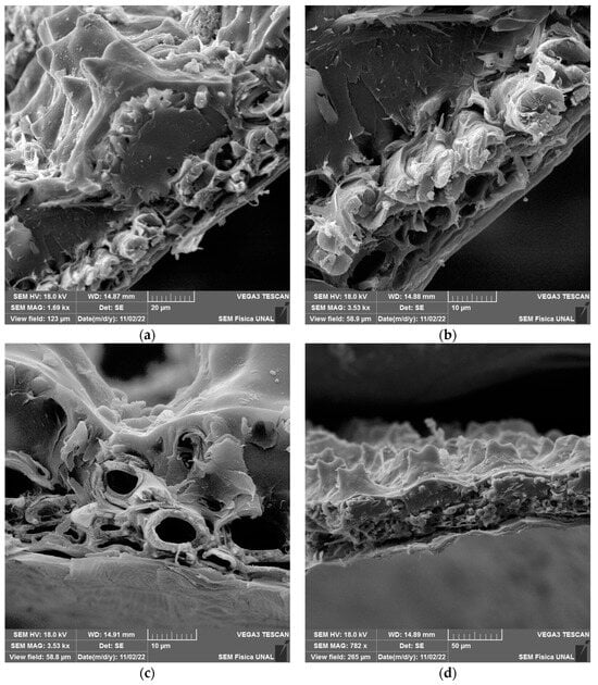 Scanning electron microscopy was performed with magnifications between ×200 and ×5000 to establish the structure present in the rice husk; in Figure 4a,c, grooves are found along the longitudinal periphery of the husk; Figure 4b,d shows the cross-section of the rice husk, which comprises the outer part of the epidermis layer, a longitudinal structure called the hypodermis, and finally (on the opposite side of the inner layer) a layer with a porous structure, called the sub-hypodermis [27].