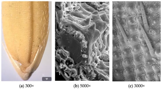 The morphology present in the hypodermis section is presented as an alignment of layers perpendicular to each other; as shown in Figure 6a, the hypodermis is intermediate between the epidermis and sub-hypodermis. The inner section of the grain epidermis, called the sub-hypodermis, is usually composed of thin-walled structures with small holes or openings [20]; these form a support and resilience structure which fulfils the function of protecting and supporting the load on the seed, as shown in Figure 6.