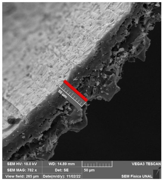 The tensile test was used to determine the maximum stress in materials by producing tangential displacements in the intercellular spaces during application of the load [18]; this means that the more spaces that occur between the planes, the smaller the area supported by the load, which weakens the material. The maximum stress is obtained as the ratio of the load on the cross-sectional area of the rice husk; for the calculation and obtaining of all results of the tension tests, an area related to the width of the perpendicular husk of the specimen of 50 µm was established, as shown in Figure 7.