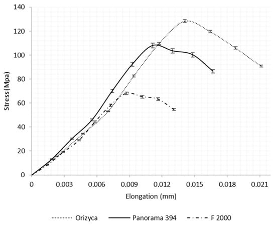 For the development of the stress tests, 34 replicates were carried out for each variety of husk studied; the results are shown below. Figure 8 shows the stress and elongation data obtained for the rice husk varieties. The ultimate tensile stress for the Orizyca husk was 128 MPa and the elongation was up to 0.014 mm. The F 2000 variety showed an elongation of 0.009 mm, with a maximum stress of 67.23 MPa. The results obtained for Panorama 394 showed an elongation of 0.011 mm and a maximum stress of 108.83 MPa. Significant differences were found between stress and elongation for the rice husk varieties (p < 0.05).