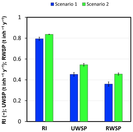 The results of the RI and UWSP reflected the RWSP, which remained higher in Scenario 2 (0.46 ± 0.01 t inh−1 y−1 vs. 0.36 ± 0.02 t inh−1 y−1). Those values were comparable to the Italian average (RWSP 0.32 t inh−1 y−1), but they were significantly higher than averages in other predominantly mountainous areas (e.g., southern Italy, where RWSP = 0.26 t inh−1 y−1) due to the higher performance of separate collection [39].