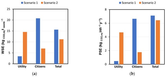In terms of PSE, the full door-to-door system remained the most advantageous, with 7.11 kgCO2, eq inh−1 y−1 vs. 6.43 kgCO2, eq inh−1 y−1 being emitted in the case of the mixed collection system (Scenario 1) with respect to the full door-to-door system (Scenario 2). As for WSE, the high amount of GHGs emitted by the utility vehicles (4.66 kgCO2, eq inh−1 y−1 vs. 0.47 kgCO2, eq inh−1 y−1 in Scenarios 2 and 1, respectively) was compensated for by the significantly lower amount of GHGs emitted by citizens (1.77 kgCO2, eq inh−1 y−1 vs. 6.65 kgCO2, eq inh−1 y−1).