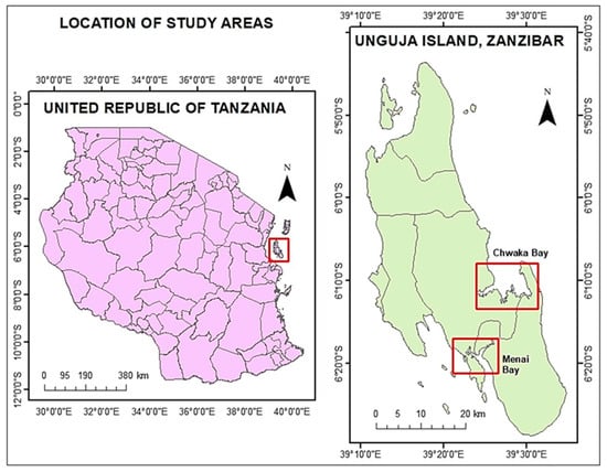 The study sites were the Chwaka and Menai Bays, the two largest mangrove bays on Unguja Island in Zanzibar (Figure 1). In 1997, the Revolutionary Government of Zanzibar declared both sites protected zones. Ten mangrove species exist on the mainland and Zanzibar []. Chwaka Bay has the largest mangrove area of c. 2294 ha []. All ten species of mangrove in Tanzania are present in the forests of Chwaka Bay []. Menai Bay is composed of c. 988 ha of mangroves. Because of extensive deforestation, Menai Bay’s ecological makeup differs significantly from the nearby Jozani mangrove forest. The Charawe, Chwaka, Ukongoroni, Unguja Ukuu, and Uzi wards occupy the Chwaka and Menai Bay areas, and according to the 2022 census report, they have human populations of 954, 3196, 896, 1563, and 1801, respectively. These communities rely on the mangrove ecosystems in the two bays for their survival. Zanzibar, which was designated a UNESCO World Heritage Site in 2000, has exceptional beaches, coral reefs, and a rich culture [].