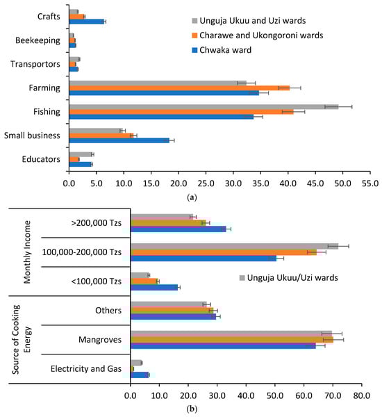 (a) Occupation of respondents (in percentage) in Chwaka, Ukongoroni, Charawe, Unguja Ukuu, and Uzi wards in Chwaka and Menai Bays, Unguja Island, Zanzibar. Error bars are 95% confidence intervals. (b) Average monthly income and source of cooking energy of the households in Chwaka, Ukongoroni, Charawe, Unguja Ukuu, and Uzi wards in Chwaka and Menai Bays, Unguja Island, Zanzibar. Error bars are 95% confidence intervals.