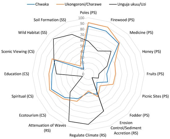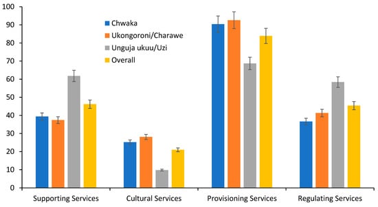 The medium scores for cultural services were for spiritual beliefs, which may be attributed to the transition of coastal communities from traditional spiritual beliefs to modern religious beliefs in Islam and Christianity []. Provisioning services, such as poles, firewood, and medicine, were given the highest scores by the Chwaka, Ukongoroni, Charawe, Unguja Ukuu, and Uzi wards, which was in contrast to honey, fruit, picnic sites, and fodder, which were given lower scores. The Chwaka, Ukongoroni, and Charawe wards gave cultural services, such as places for spiritual activities and scenic beauty, higher ratings than regulating services, which was likely due to their direct advantages that positively impact the communities’ means of livelihood. Cultural services, e.g., education and ecotourism, also received high scores. These findings were similar to Lee et al. [], who demonstrated that coastal communities have different perceptions of ecosystem services in their localities because of socioeconomic status. Fishing is one of the most vital sources of income on Zanzibar Island; therefore, the Unguja Ukuu and Uzi wards highly valued habitat-related services, but the Chwaka, Ukongoroni, and Charawe wards awarded wild habitats the lowest marks since they did not see the importance of mangroves as habitat grounds.