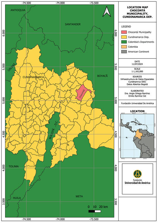Choconta is located in the department of Cundinamarca in Colombia, approximately 75 km from Bogotá D.C., which provides the region with agricultural economic growth opportunities for the variety of fruits, vegetables, and tubers that are offered there. Choconta is part of the Northern Sabana bordering Suesca, Sesquile, Guatavita, Manta, Tibirita, Villapinzon, and Macheta, forming the province of the Almeydas shown in Figure 1 [16].