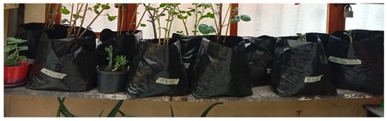 To plant the potatoes, 12 black sacks of 10 kg capacity were filled according to the compost proportion described in the experimental design (0%, 25%, 50%) [24]. The percentages were taken in relation to the total of 8 kg of soil contained in each bag. Figure 2 shows the setup for potato cultivation implemented in this research. The greenhouse where the potatoes were grown simulated the humidity (~83%), pH (5.5–7), and temperature (12–18 °C) conditions of Choconta.