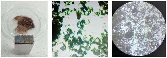 During the mineral characterization, passing a magnet over the soil revealed the presence of magnetite. Additionally, the presence of quartz (irregular, similar to broken glass), feldspars (orange colors), hornblende, and pyroxenes (dark green fibers) were identified using a 10× microscope, as shown in Figure 3.