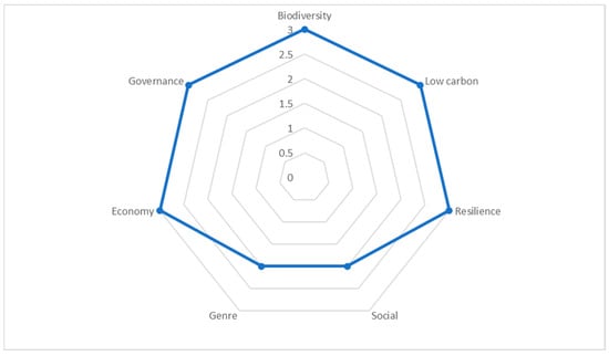 The synthetic matrix of the sustainable development analysis was used to examine the factors of biodiversity, resilience, low carbon, economy, governance, gender, and social (Figure 5) as they relate to this research. The study aims to structurally improve the state of biodiversity and/or ensure the ecological quality and sustainability of natural resources. This research contributes structurally to the country’s low-carbon trajectory, reducing climate risks through actions to strengthen chains, sectors, and territories for the improved stewardship of natural resources and agricultural crops. The findings in this research contribute significantly to the transition towards a more sustainable and resilient economy with the capacity to react to challenges and governance through decision making. In the social field, the project has as a secondary objective to contribute to the empowerment of women, a reduction in gender inequalities, and a reduction in multidimensional inequalities of greater inclusion.