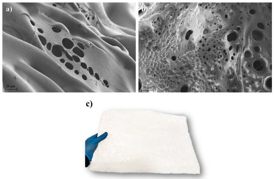Selected (a) PUR-6 and (b) PUR-8 SEM micrographs, and (c) the material’s visual appearance.