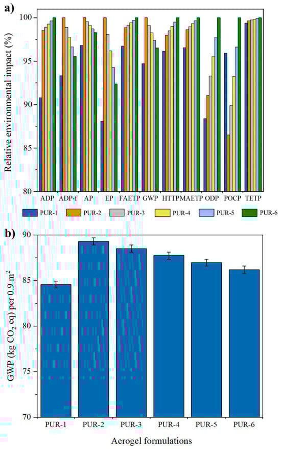 (a) Relative environmental impacts and (b) GWP (kg CO2 eq) of six PUR aerogel formulations based on their TUs (0.9 m2).
