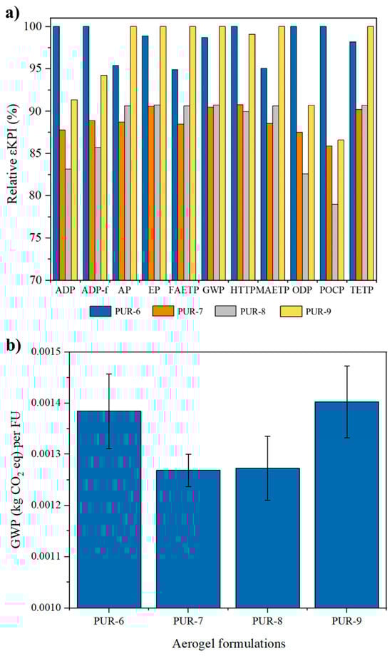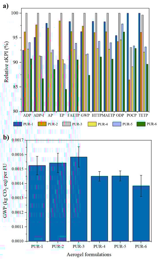 (a) Relative calculated εKPI values and (b) GWP (kg CO2 eq) of six PUR aerogel formulations based on their FUs.