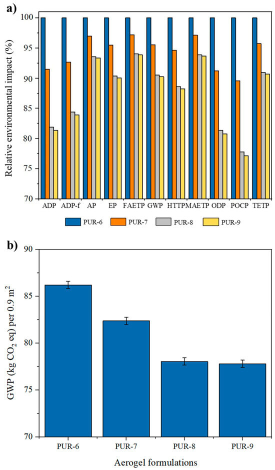 The environmental performance of four different aerogel formulations, denoted as PUR-6 to PUR-9 with solids content percentages of 10.8%, 7.2%, 3.7%, and 3.2%, respectively, has been analyzed. The outcomes of this conducted analysis, aimed at comprehending the relative environmental impacts of aerogels with varying solids contents based on their TUs, are presented in Figure 4a. The absolute values are shown in Table S3 within the Supplementary Materials.
