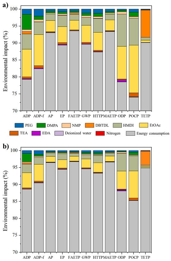 - The environmental impacts of certain chemicals were estimated using proxies. In this context, substitutes such as ethylene glycol in place of polyethylene glycol, methacrylic acid instead of DMPA, and methylene diphenyl diisocyanate in place of HMDI were used. Environmental burdens associated with equipment and human labor were excluded from the evaluation.