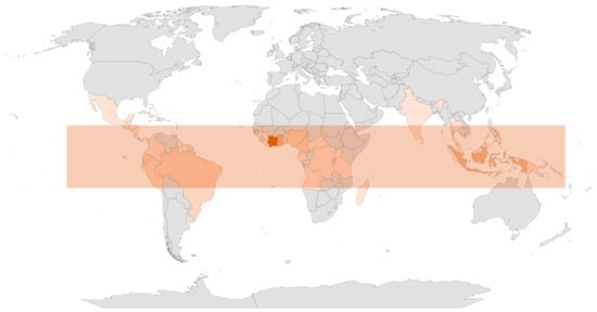 Cacao (Theobroma cacao L.) is a species native to the tropical forests of the equatorial zone, the seeds of which, when dried, are used to make chocolate. From a nutritional point of view, it belongs to the category of “psychoactive” foods [1], among which are also tea and coffee, i.e., foods that possess tonic properties and act on the central nervous system since they contain caffeine, theine, ephedrine, and theobromine [2]. From a commercial point of view, on the other hand, it is an important cash crop for developing countries and an important branch of the food industry for industrialised countries [3]. Indeed, it is a resource that plays a very important role globally because it is a basic ingredient for the confectionery industry [4], as well as one of the most produced and traded commodities. Cacao grows exclusively in areas characterised by specific soil and climatic conditions that make its cultivation possible in just a few countries in the equatorial belt, in a remote area known as the cocoa belt (Figure 1). Although it is produced in various nations, nearly 2/3 of the world’s cocoa comes from West Africa, particularly from Côte d’Ivoire (38% of production, or about 2.23 million tons of cocoa) and Ghana (19% of production, or 1.1 million tons of cocoa) [5], which are found to be the first and second largest producers of cocoa globally, respectively (Table 1). Therefore, cocoa production contributes significantly to their GDP (in the range of 7.5–9%) [6] and to their exports (about 90% of Ghana and Côte d’Ivoire’s exports are attributable to cocoa) [7].
