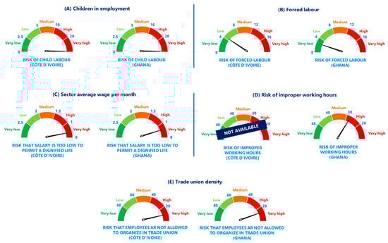 Two categories of stakeholders (Workers and Local Community) and eight categories of risk (Child Labor, Forced Labor, Fair Salary, Working Time, Workers Rights, Migrant Workers, Environmental Footprint, and GHG Footprint) were chosen, each of which in turn is defined by subcategories and indicators. The risk categories were chosen both because of data availability and because of their relevance to issues related to the Cocoa sector. The risk categories, subcategories, indicators, and PRPs were defined by PSILCA [37] and are shown in the Supplementary File (Tables S1 and S2). Then, the data were normalised according to five risk scales defined by PSILCA: very low, low, medium, high, and very high. These levels were represented graphically using a tachometer chart, where each risk level was associated with a colour (e.g., very low risk = dark green, low risk = light green, medium risk = orange, high risk = red, very high risk = dark red). As an example, for the trade union density indicator, the five PRPs are 80% < y (very low risk), 60% < y < 80% (low risk), 40% < y < 60% (medium risk), 20% < y < 40% (high risk), and 20% > y (very high risk). Therefore, if a value was to be 30%, then it would fall into the 20–40% PRPs, defining a high risk, and thus graphically, a red colour. After that, each risk scale was associated with a score from 0 to 5 (0 = no risk, 1 = very low risk, and so on up to very high risk) so that the results could be standardised and represented graphically by a scatter plot.