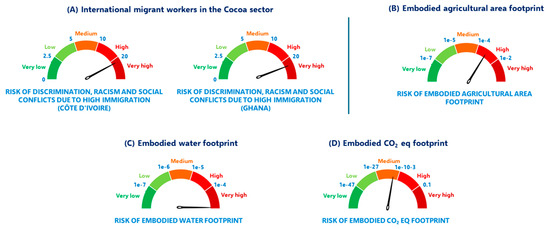As for this risk sub-category, the S-LCA results showed that in Ghana and Côte d’Ivoire, with 23.2% and 25%, respectively, there is a very high risk of discrimination, unfair labour conditions, and conflicts with local communities (Figure 3A). Indeed, this is because small cocoa farmers have little financial capacity to hire the required labour, which is why they use cheaper sources of labour such as migrant labour [72]. However, some literature studies, including Kessie et al. (2015) [73] and Manoj and Viswanath (2015) [74], highlight how migrants face issues related to low wages, precariousness, and lack of bargaining power, which contribute to the social unsustainability of cocoa production. For Côte d’Ivoire, migration flows come mainly from Burkina Faso, Mali, and Guinea [75], while for Ghana, migration flows come mainly from Nigeria, Togo, and Burkina Faso [76]. Therefore, while migration practices have contributed a great deal to the economies of the two countries, the working conditions of a large amount of migrant labour could lead to a very high risk that the chocolate purchased worldwide is produced from poor working conditions such as low pay, unsafe working environments, no freedom, and no rights. Moreover, from a social point of view, migrants might still suffer discrimination and exclusion within local communities, exacerbating their conditions.