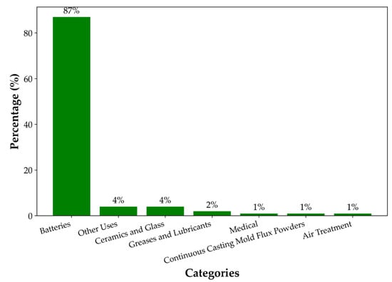 From 2000 to 2017, the growth in battery demand averaged 20% per year, and it is estimated to be duplicated during the 2018–2028 period [14,15,16]. By 2030, forecasts suggest that the demand for batteries will be 5.5 times higher than in 2018 [17]. This increase in demand is driven by the expected global fleet of 300 million EVs by 2030, which would account for more than 60% of new car sales, a significant increase compared to the 4.6% share they represented in 2020 [18,19]. Although lithium applications differ by region, global end uses during 2023 have been estimated as follows: 87% for batteries, 4% for ceramics and glass, 2% for lubricating greases, 1% for air treatment, 1% for continuous casting mold flux powders, 1% for medical purposes, and 4% for other uses, as shown in Figure 1 [20]. However, the substitution of lithium compounds is feasible in several sectors, including batteries, ceramics, greases, and manufactured glass, but it requires an exhaustive evaluation.