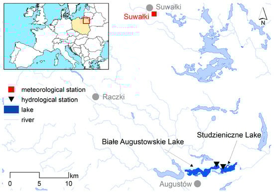 This study focuses on two lakes located in northeastern Poland (Figure 1): Białe Augustowskie and Studzieniczne. As previously emphasized, these lakes have the longest continuous dataset regarding water temperature, covering the years 1954–2023. Both lakes are situated within the town of Augustów (approximately 30,000 residents) and are part of the Augustów Canal, which connects the region’s rivers to the Niemen River and, subsequently, to the Baltic Sea. They are among the major tourist attractions in the area, offering opportunities for water sports, fishing, and tourism facilities along their shores. The genesis of the lakes is linked to the Scandinavian ice sheet, and as glacial lakes, they possess diverse morphometry. The basic parameters are summarized in Table 1.