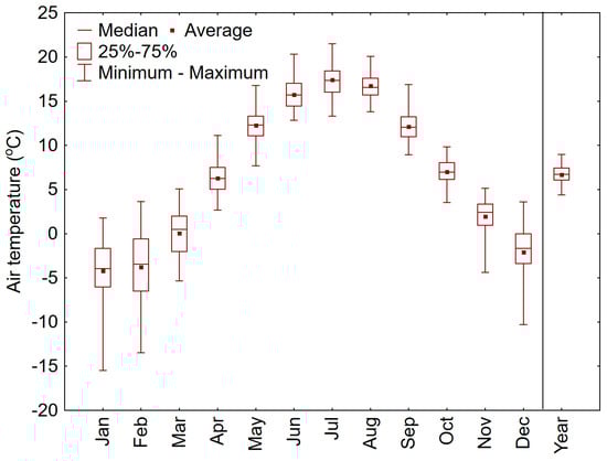 The average temperature at the meteorological station in Suwałki over the period from 1954 to 2023 was 6.7 °C, with variability ranging from 4.4 to 9.0 °C. Considering the average monthly temperatures, January is the coldest month, with a multi-year average temperature of −4.2 °C, while July is the warmest month, with an average temperature of 17.4 °C. The variability of the average monthly temperatures from 1954 to 2023 was highly diverse, ranging from 6.2 °C in August to as much as 17.3 °C in January (Figure 2).