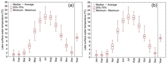 With this temperature trend, the average water temperature in Lake Białe Augustowskie from 1954 to 2023 was 9.8 °C, with variability ranging from 8.1 to 11.6 °C. The lowest water temperatures in the lake were recorded in February (average 1.2 °C), while the highest were in July (average 20.5 °C, Figure 3). The highest variability of average monthly temperatures occurred in June (with a range value of 10.0 °C and standard deviation of 1.8 °C), while the lowest was in February (with a range value of 2.7 °C and standard deviation 0.6 °C). The water temperatures in Lake Studzieniczne were at the same level, considering annual average values, and very similar when considering monthly values. In the lake, the lowest variability of average monthly water temperatures occurred in February, while the highest was in May.