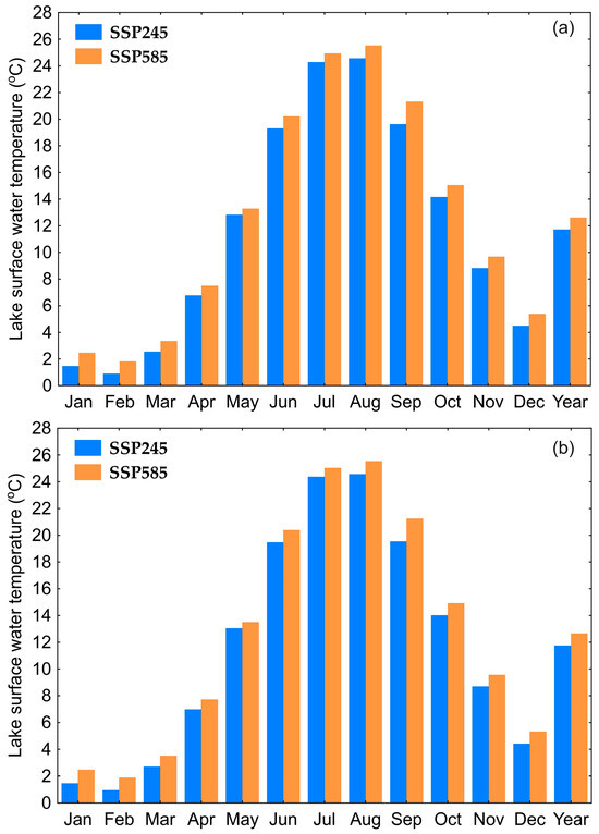 Based on daily water temperatures from the air2water model for the period of 2024–2100, average monthly and annual values were calculated for both lakes. In both lakes and for both scenarios, SSP245 and SSP585, water temperatures are higher than historical values (Figure 5). These differences are significant at the 0.05 level based on the Student’s t-test. The exception is May for the SSP245 scenario, for which water temperatures remain at a similar level, and February, for which water temperatures decrease by about 0.3 °C. In Lake Białe Augustowskie, the average annual temperature under the SSP245 scenario is expected to rise by an average of 1.8 °C, and by 2.8 °C for SSP585. The highest temperature increases will occur in the summer months (July–September), ranging from 3.4 to 4.3 °C for SSP245 and from 4.5 to 5.3 °C for SSP585. In Lake Studzieniczne, the increase in average annual temperature will be at the same level as in Lake Białe Augustowskie. The highest temperature increases will also occur in the summer months (July–September), ranging from 3.5 to 4.4 °C for SSP245 and from 4.6 to 5.4 °C for SSP585. The lowest changes in water temperature are expected in May.