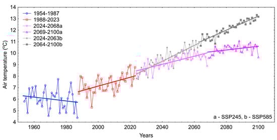 The obtained results indicate that during the period of 1954–2023, the air temperature increased by 0.33 °C per decade. Furthermore, in the future (2024–2100), there will also be an increase in air temperature at average rates of 0.29 and 0.65 °C per decade for SSP245 and SSP585, respectively. However, considering the subperiods determined based on the Pettitt test, it was shown that during the period of 1954–1987, the changes were not statistically significant, while during the period of 1988–2023, the temperature increased at a rate of 0.40 °C per decade. In the future (2024–2068), according to the SSP245 scenario, changes in air temperature will occur at an average rate of 0.35 °C per decade, while in the years 2069–2100, the changes will not be statistically significant. According to the SSP585 scenario, in both periods, there will be an increase in air temperature at rates of 0.66 and 0.59 °C per decade, respectively, for the years 2024–2063 and 2064–2100 (Figure 6).