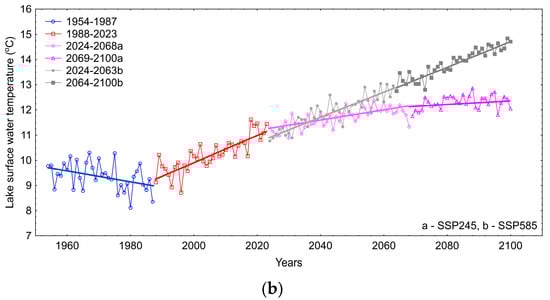 In the final stage, an analysis of long-term changes in air temperature and surface water temperature in the lakes was conducted for the historical period of 1954–2023 and the future period of 2024–2100 for the SSP245 and SSP585 scenarios. Additionally, the analysis was performed for subperiods identified through the Pettitt test for breakpoints. For the historical periods, the analysis was conducted for the periods of 1954–1987 and 1988–2023; for SSP245, for the periods of 2024–2068 and 2069–2100; and for SSP585, for the periods of 2024–2063 and 2064–2100. The results of the analysis of the annual periods are presented in Table 4, while the complete summary of results for the monthly periods is presented in Tables S1–S3.