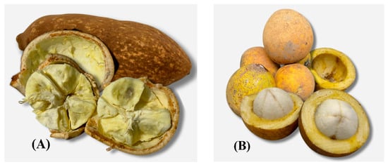 Ripe cupuaçu (~4 kg) and bacuri (~10 kg) fruits (Figure 1) were obtained from street markets in Belém-PA (Latitude 01°27′21″ S and Longitude 48°30′16″ W). The access to the selected fruits was registered in the Brazilian National System for the Management of Genetic Heritage and Associated Traditional Knowledge (SisGen, A8E1050). The fruits were selected and sanitized by immersion in a sodium hypochlorite solution (100 μg/mL) for 10 min. The soft pulps from each fruit were manually separated from the epicarp and seeds using scissors and stainless steel knives, being divided into two portions: one portion was frozen at −18 °C for freeze-drying (control experiments), and the other portion was immediately subjected to the oven-drying process. The process previously described as well as the packaging and storage method were carried out individually for each pulp.