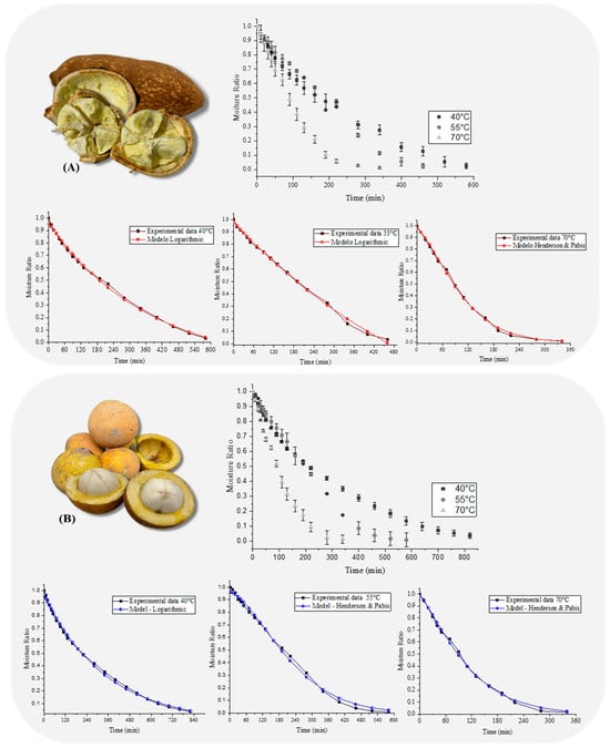 Oven-drying curves for cupuaçu (A) and bacuri (B) pulps at 40 °C, 55 °C and 70 °C, followed by the experimental drying data and curves predicted by the Logarithmic or Henderson and Pabis models.