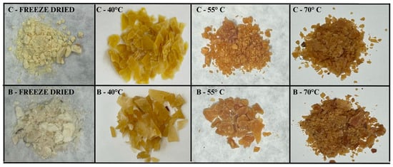 Cupuaçu (C, in the first row) and bacuri (B, in the second row) pulps after freeze-drying and oven-drying at 40 °C, 55 °C and 70 °C.