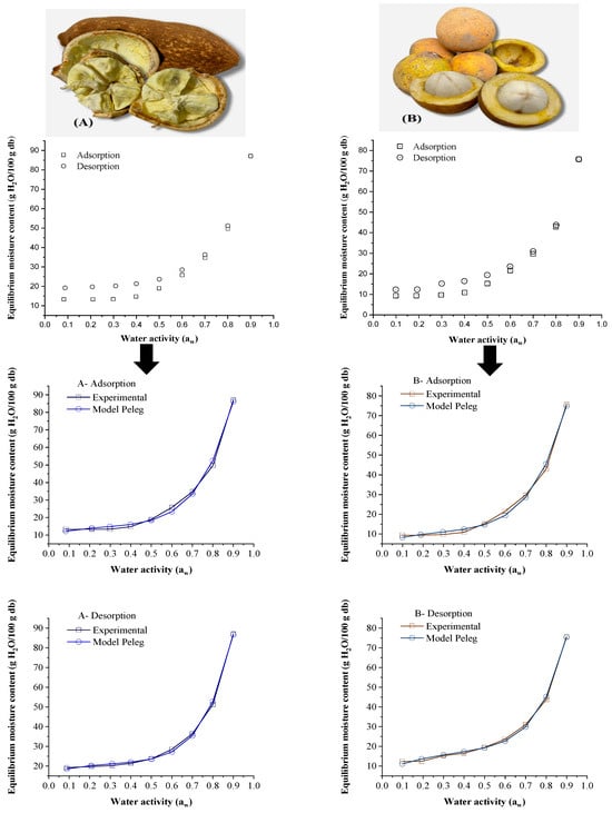 Moisture sorption isotherms of cupuaçu (A) and bacuri (B) pulps dried at 70 °C, followed by the adsorption and desorption fit by the Peleg model.