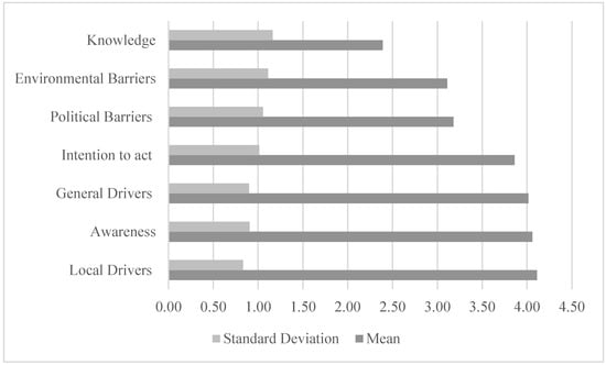 In the following, we present the perception and attitude towards an agro-biomass heating system of the rural population surveyed. Our data include no significant gender gap between responses, with most of the participants being between the age of 24–34 (35%) and 45–54 years old (38%) and the majority having a secondary education (62.1%) or a bachelor’s degree (24.4%). Figure 1 presents the mean, which ranges from 1 to 5, and standard deviation of survey responses for various factors including “Knowledge”, “Environmental Barriers”, “Political Barriers”, “Intention to Act”, “General Drivers”, “Awareness”, and “Local Drivers”. The data highlight the central tendency of and variability in perceptions or evaluations associated with each factor, allowing for a better understanding of the prioritized concerns or influences as indicated by the respondents. According to the standard deviation coefficient, “Knowledge” and the “Intention to Act” exhibit a higher degree of consensus among respondents, in contrast with “Environmental and Political barriers”, which show larger deviations, suggesting that opinions vary significantly among participants regarding these issues.