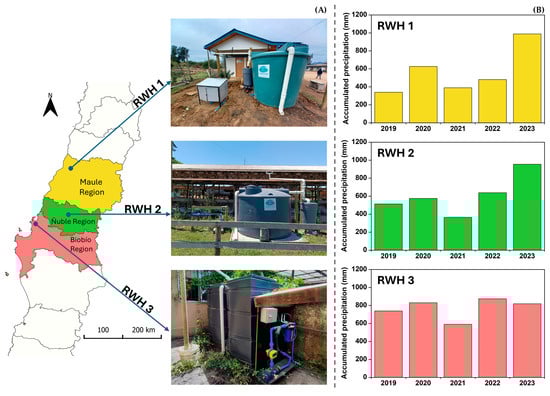 This study was carried out on three RWH systems located in different regions of Chile: Maule (RWH 1), Ñuble (RWH 2) and Biobío (RWH 3), as shown in Figure 1. In the case of RWH 1 and RWH 2, these systems were installed in rural educational establishments called “Ana Luisa Espina Rivero School” and “Agricultural High School of Chillán”, respectively. The two RWH systems were located in the rural areas of Chilean central zone called “Curepto” and “Cato”, respectively, where the primary economic activities are agriculture and livestock farming (Figure 1A). On the other hand, RWH 3 was implemented in the Research Center of Water Research Center for Agriculture and Mining (CRHIAM) at the University of Concepción. This system was located in an urban area of Concepción, where the primary economic activities include services such as education and retail commerce. Figure 1B. shows the rainfall patterns of locations where RWH systems are installed. The accumulated precipitation in the area where RWH systems were located fluctuated between 800 and 1000 mm during 2023. From 2010 to 2022, the accumulated precipitations remained relatively stable in the areas of RWH 1 and RWH 2, and in 2023, it was rainier than the previous year. In the area of RWH 3, this parameter remained relatively stable except for the year 2021. In these systems, the harvested water was used for irrigation (RWH 2 and RWH 3) and to supply water for toilets (RWH 1).
