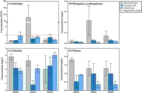 Concentrations of different contaminants in RWH systems. (A) Turbidity; (B) Phosphate as Phosphorus, (C) Chloride, (D) Nitrate. Notes: The regulatory limit was only considered for turbidity. Concentrations of phosphate as phosphorus, chloride and nitrate are high (10 mg/L, 10 mg/L and 300 mg/L, respectively) and they affect the quality of the figure.