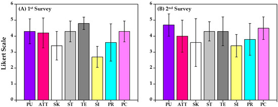 Results of (A) 1st survey and (B) 2nd survey. PU: perceived usefulness; ATT: attitude related to RWHs; SK: subjective knowledge; ST: social trust; TE: technological environment; SI: social influence; PR: perceived risk; PC: perceived cost.