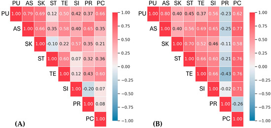Correlation matrices of evaluated aspects during (A) first survey and (B) second survey (PU: perceived usefulness; AS: acceptance of the system; SK: subjective knowledge; ST: social trust; TE: technological environment; SI: social influence; PR: perceived risk; PC: perceived cost).