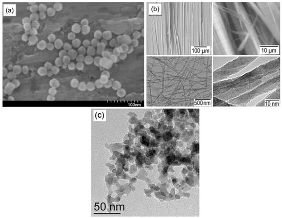 Electron microscopy of nanoparticles: (a) silica oxide nanoparticles (Ludox TM-50); (b) aluminum oxide nanofibers; and (c) aluminum oxide nanoparticles.