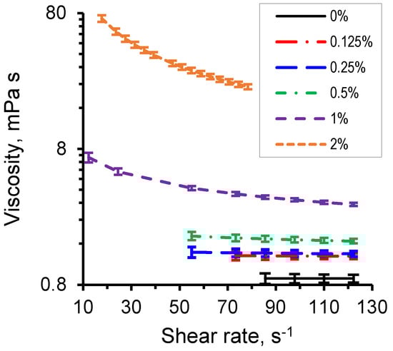 One of the most significant properties of suspension is its viscosity. Viscosity plays a pivotal role in enhanced oil recovery in reservoir flooding applications. The higher the viscosity coefficient, the more effective the use of nanosuspension becomes. Consequently, the data on the viscosity coefficient of nanosuspension are of significant importance. The viscosity was measured utilizing a Brookfield DV2T rotational viscometer, which employs a calibrated spring to measure the twisting force exerted upon it as the spindle is rotated at a constant speed within the liquid under study. The Brookfield DV2T rotational viscometer allows one to study the viscosity–shear rate dependence. This is important for non-Newtonian media, such as nanofiber suspensions. The Brookfield DV2T viscometer is reported to have a stated error of ±2%, depending on the range used. Given that nanosuspensions frequently exhibit non-Newtonian properties, the present study employed a comprehensive approach to assess the dependence of viscosity coefficient on shear rate across the entire range of variation. The temperature was carefully controlled throughout the measurement process. All data presented below were obtained at 25 °C.