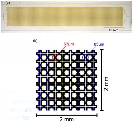 The dimensions of the 4 mm thick microfluidic chip were 92.5 × 15.0 mm2. The area of the porous region of the microchip was 10 × 60 mm2 (see Figure 3a). The porous area was created by a 150-fold repetition of a 2 × 2 mm2 square (Figure 3b). The channel arrangement in the square is a grid of 8 × 8 channels, which has an almost elliptical cross-section. The channel depth and width are 100 and 110 μm, respectively. The channels in the grid are characterized by randomly distributed constrictions, which simulate the natural structure of the rock. The grid contains 38 pores with a diameter of 63 µm, 40 pores with a diameter of 85 µm, and 50 straight channels.